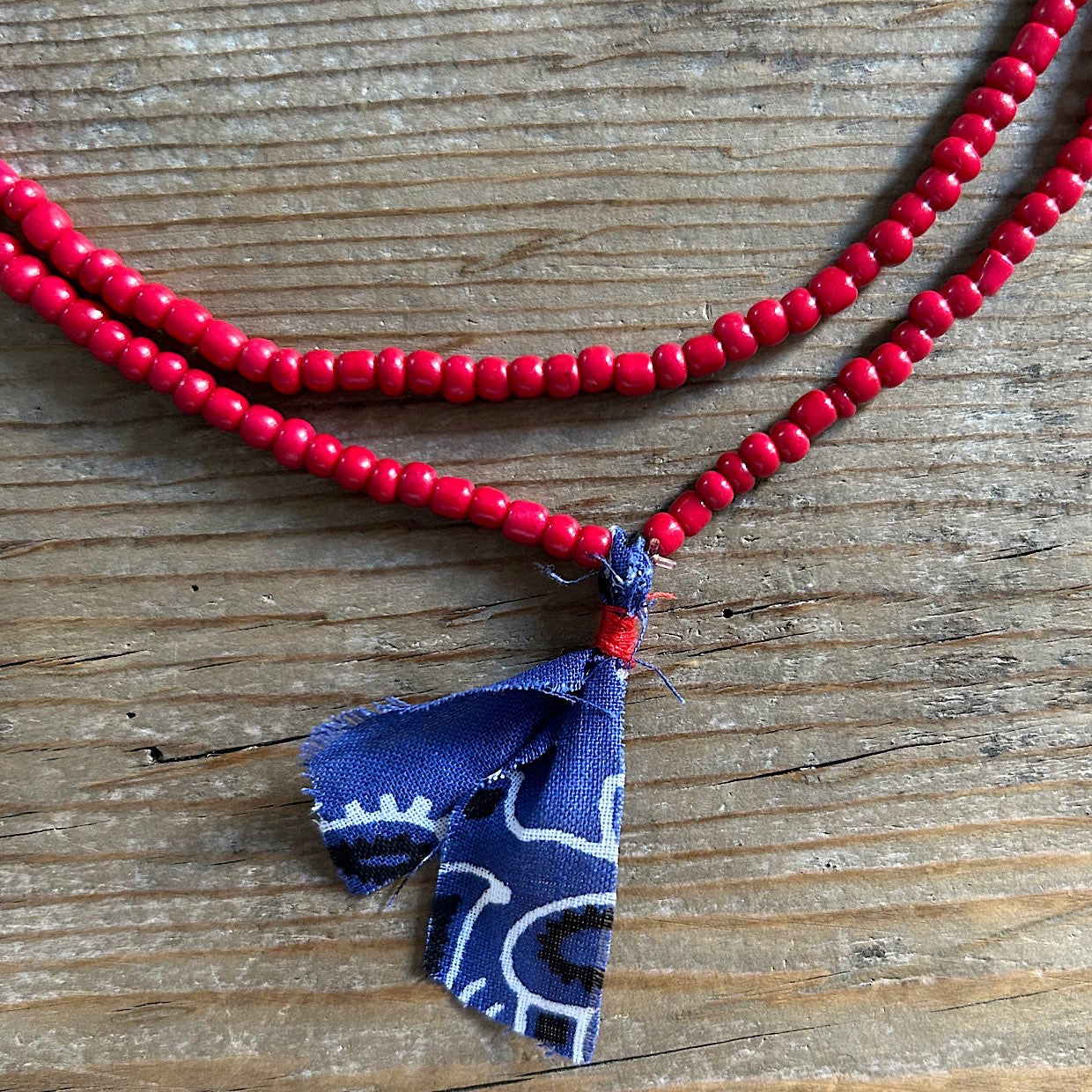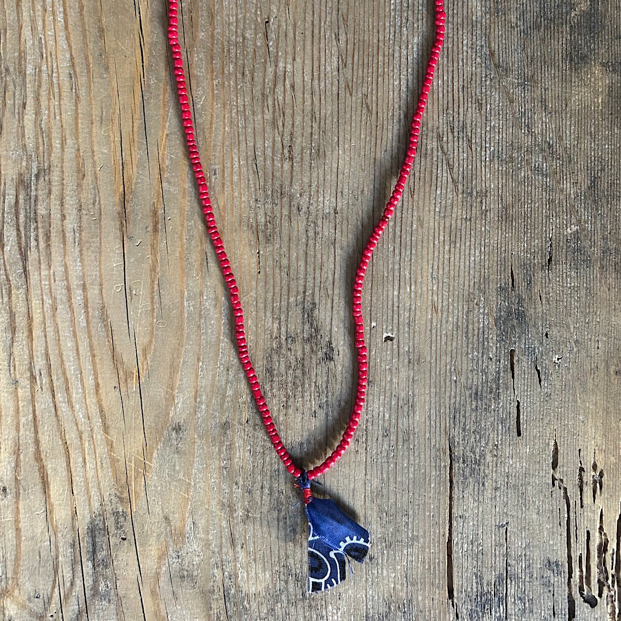 Sfere in vetro color rosso e cordino in elastico duro. Pendente di bandana legato a mano con cotone. Taglia unica circa 80 cm di circonferenza. Dimensione delle sfere circa 3,5 mm.