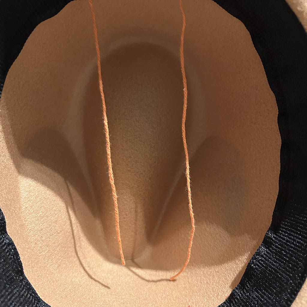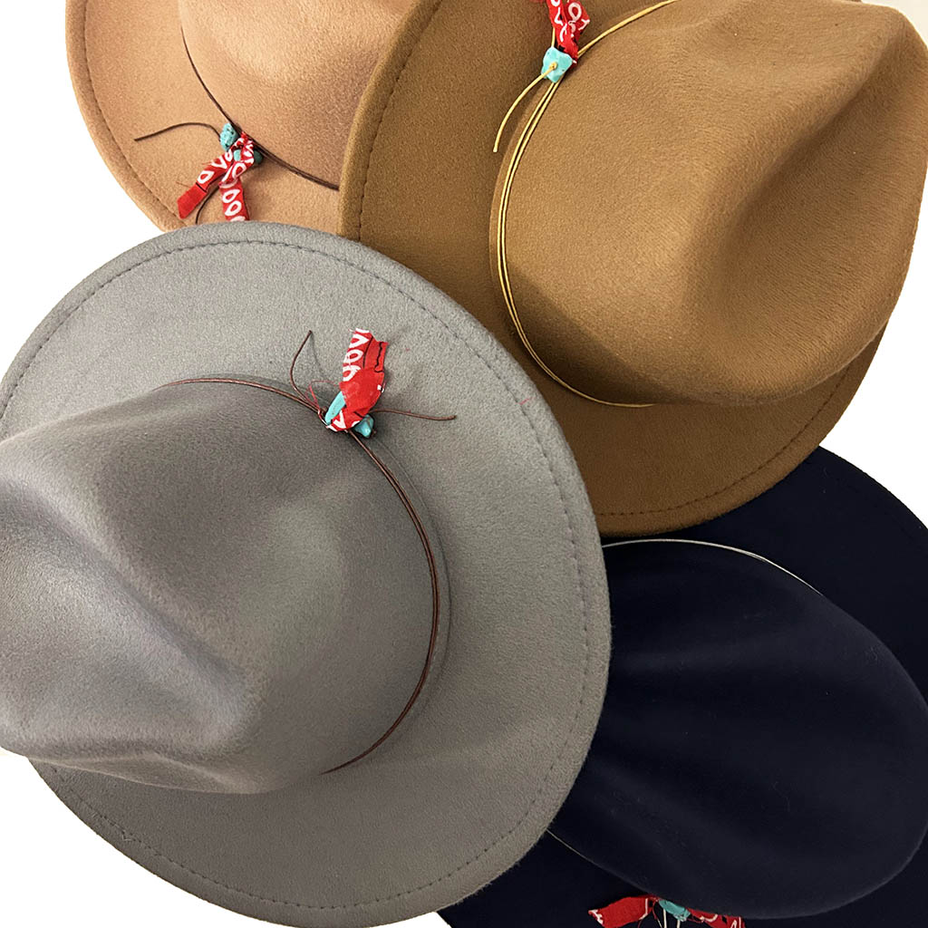 100% Felt Polyester, hand decorated in Italy with cerate cotton string, cttonn bandana and tourquoise stones paste. Adjustable size with inside string (PULL SLOWLY) Internal maximum size 57/58 cm circa.