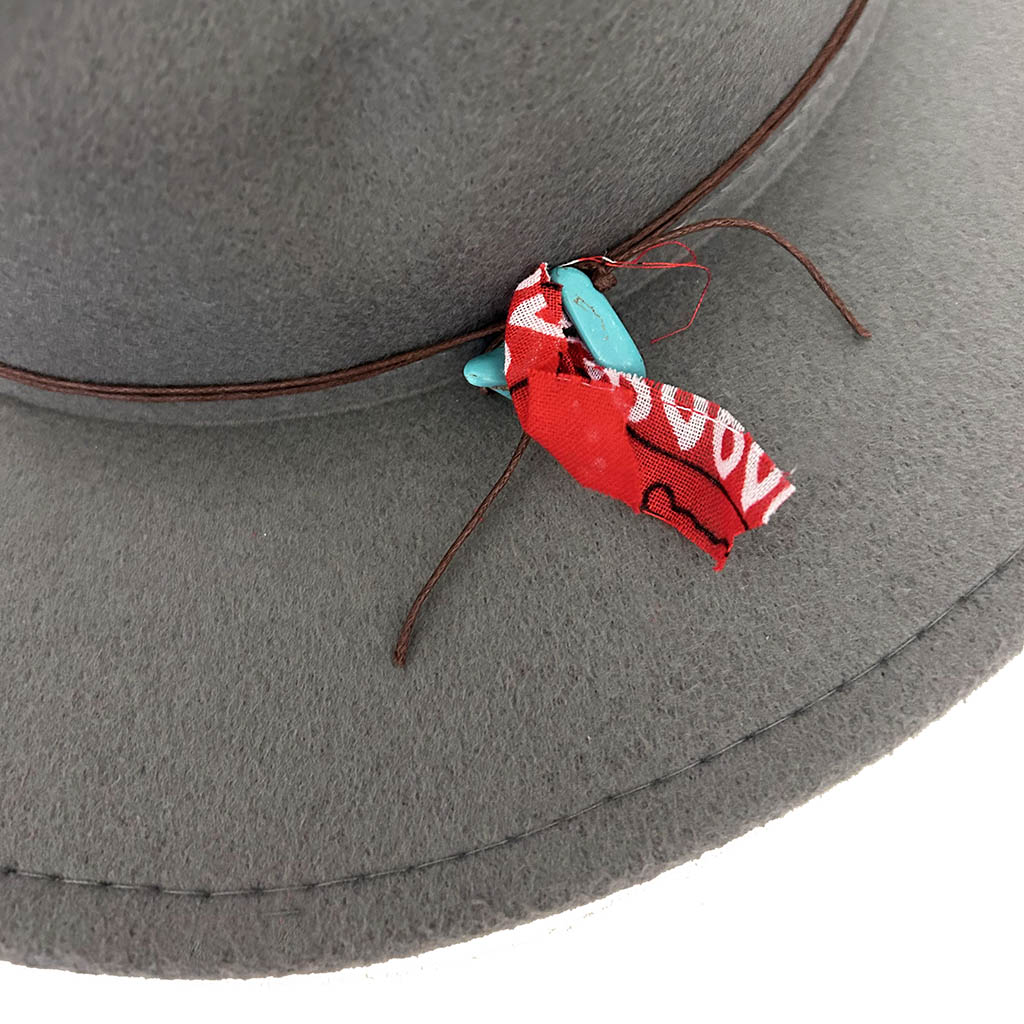 100% feltro di poliestere, decorato a mano in Italia con filo di cotone cerato, bandana in cotone e pietre in pasta color turchese. Misura regolabile con cordino interno (TIRARE LENTAMENTE ed ANNODARE I LACCI A MISURA) dimensione massima 57/58 cm circa.