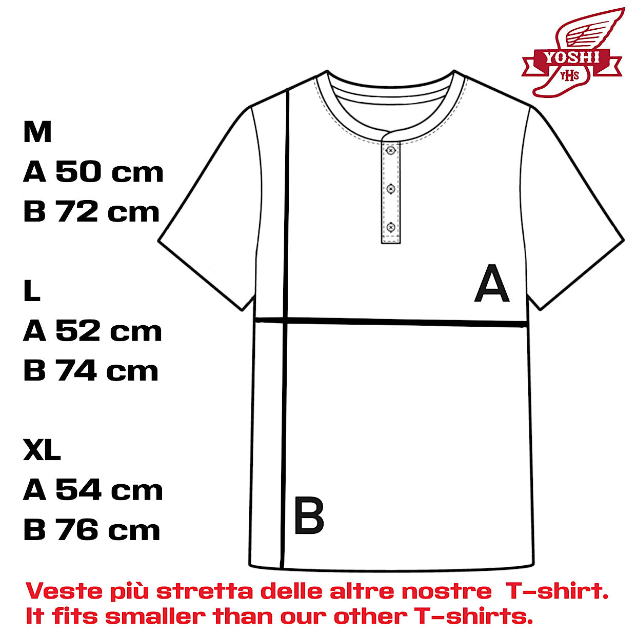 IMPORTANTE: Le taglie sono M L XL ma prima di ordinare si prega cortesemente di confrontare con una propria maglietta le misure riportate in immagine in quanto il cambio taglia comporta l'addebito delle spese di reso e di nuova spedizione.