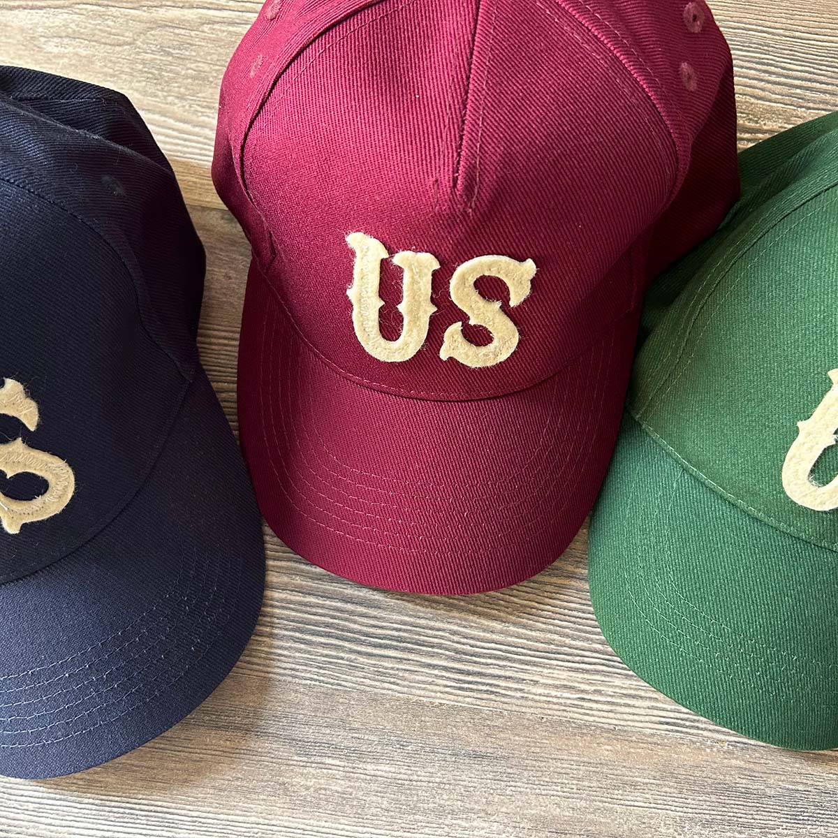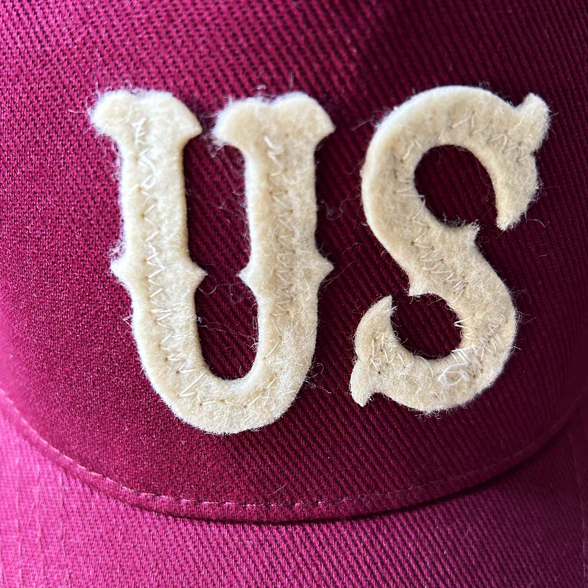 Cappellino US - 100% cotone medio pesante pettinato in 3 colori Modello 5 pannelli. Taglia regolabile mediante chiusura in velcro. Lettere intagliate in feltro color avorio US applicate a mano una ad una e ripassate con cucitura a macchina.