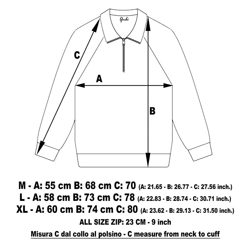 Felpa QUARTER FATTA IN ITALIA, Tessuto french terry media pesantezza 70% cotone 30% poly, 235 gr. zip parziale sino al collo. Istruzioni per la cura sull'etichetta.
