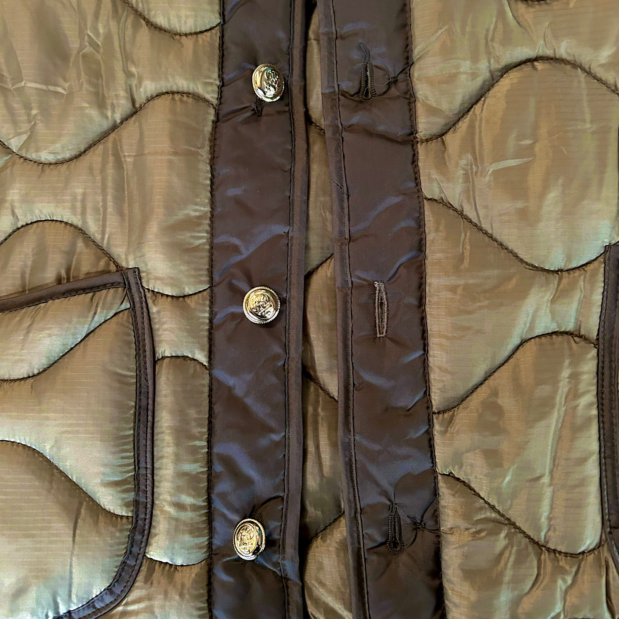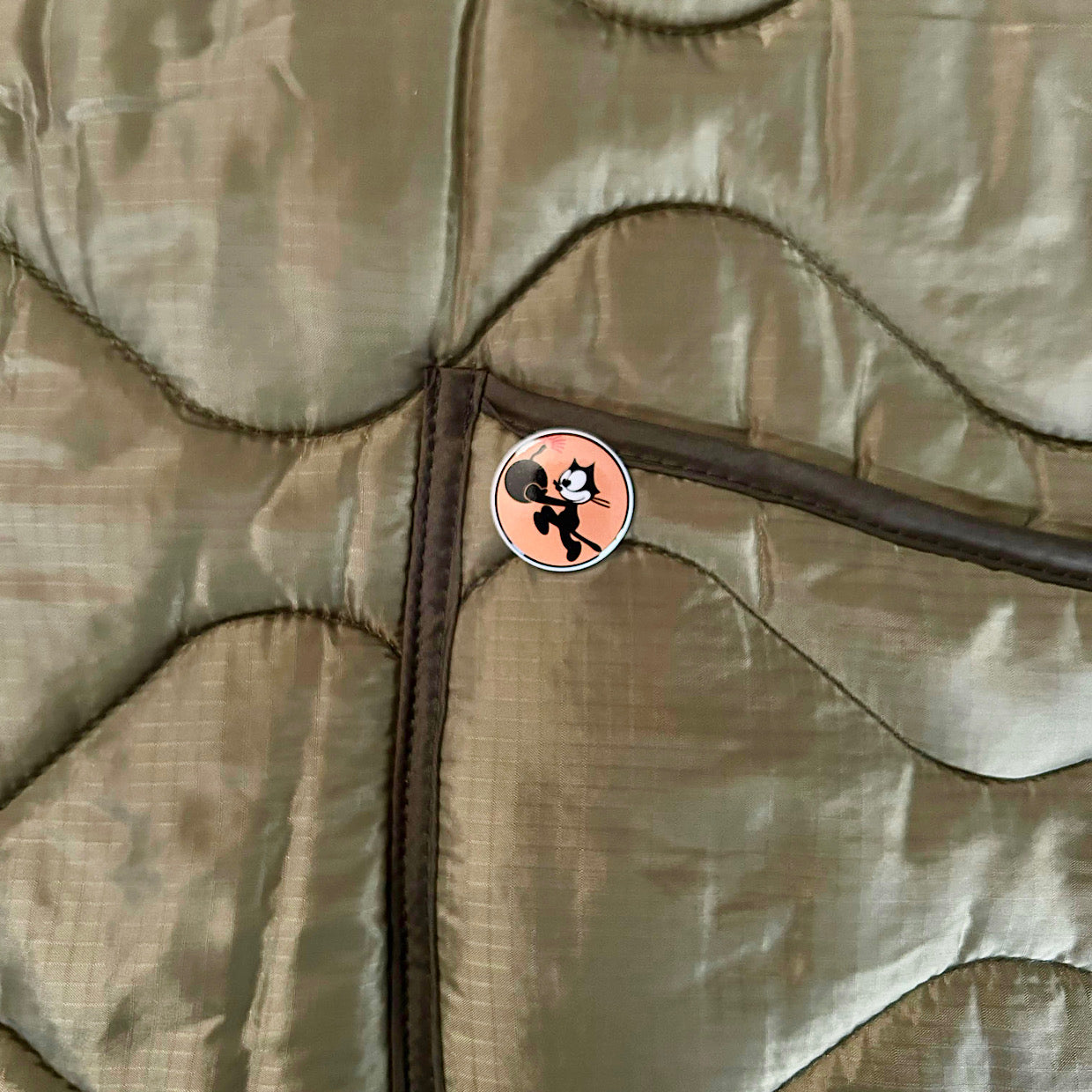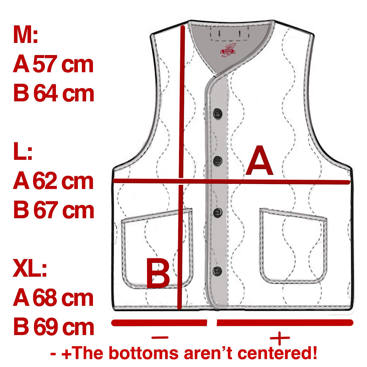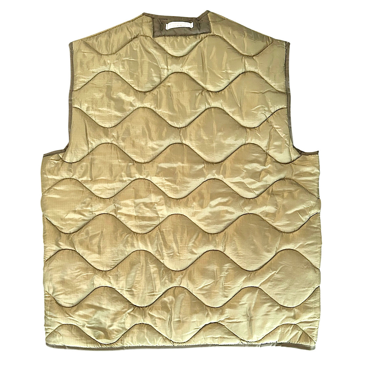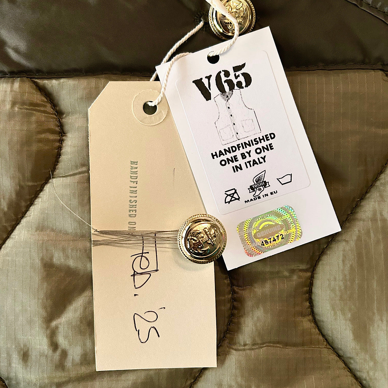 V65 LINER VEST Military green 100% polyester inside-outside and padding. Created by original M65 Linear (brand new not vintage) Finished one by one in Italy. 4 buttonholes handmade and 4 golden color buttons applied by hand. 2 applied pockets. Bomb cat pin, extra button and green row INCLUDED. ATTENTION: the middle of vest is decentred as image. Washing machine 30° - don’t use iron.