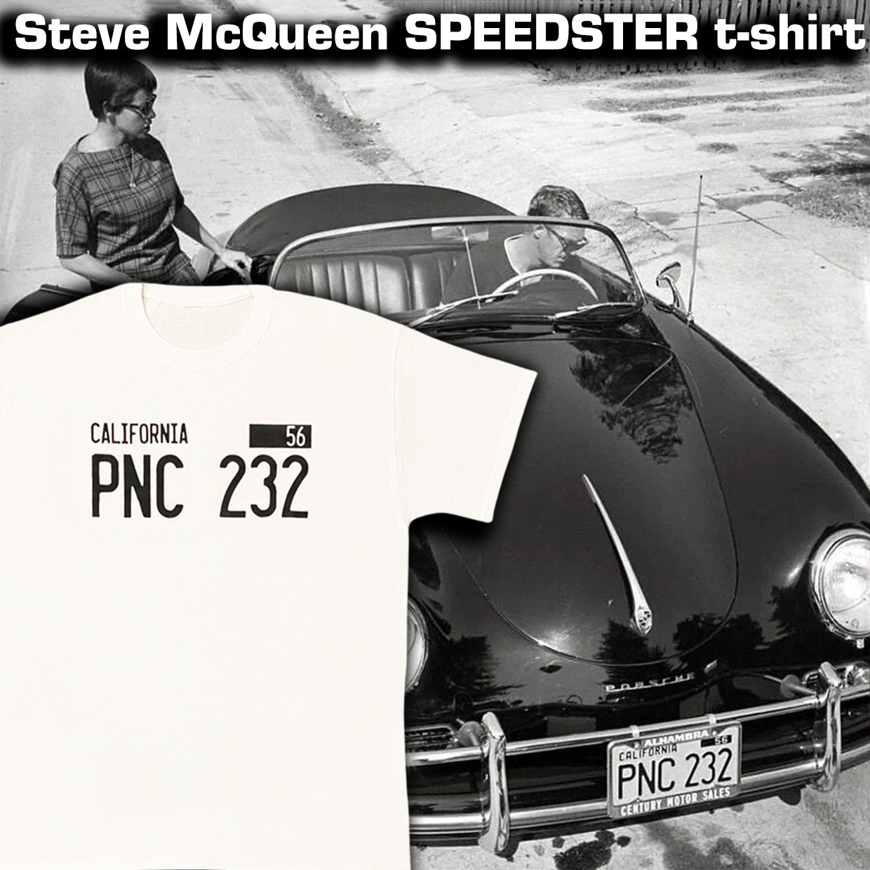 T-shirt tubolare Yoshi STEVE Speedster. 100% Cotone da 200 grammi bianca e stampa nera. La maglietta riproduce nel design e nelle dimensioni la targa della Porsche 356 Speedster posseduta da Steve McQueen nel 1956. Istruzioni per la cura sull'etichetta.