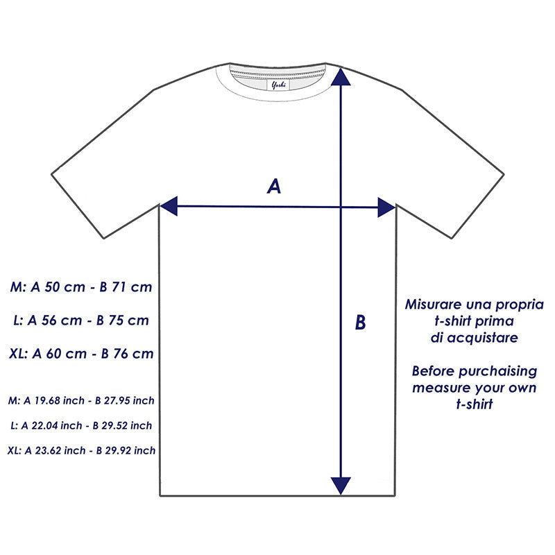 IMPORTANTE: Le taglie sono M L XL ma prima di ordinare si prega cortesemente di confrontare con una propria maglietta le misure riportate in immagine in quanto il cambio taglia comporta l'addebito delle spese di reso e di nuova spedizione.